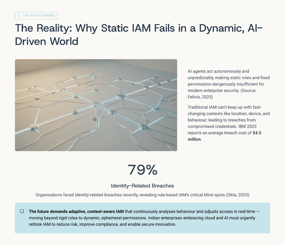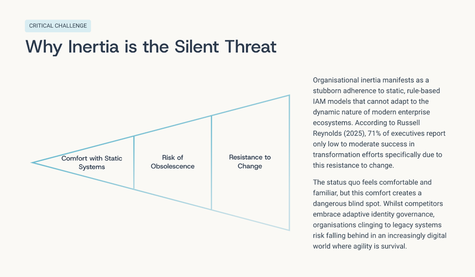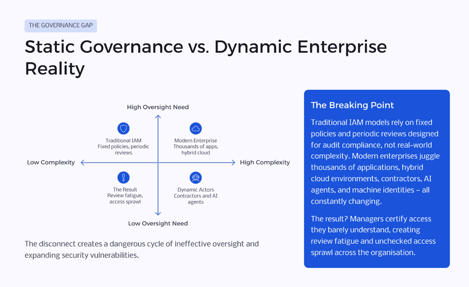 The greatest risk facing identity governance today is not cyber-attack sophistication; it is inertia. Organisations that remain committed to static rule-based IAM models will struggle to keep pace with digital transformation. The scale of modern enterprise ecosystems demands adaptability.