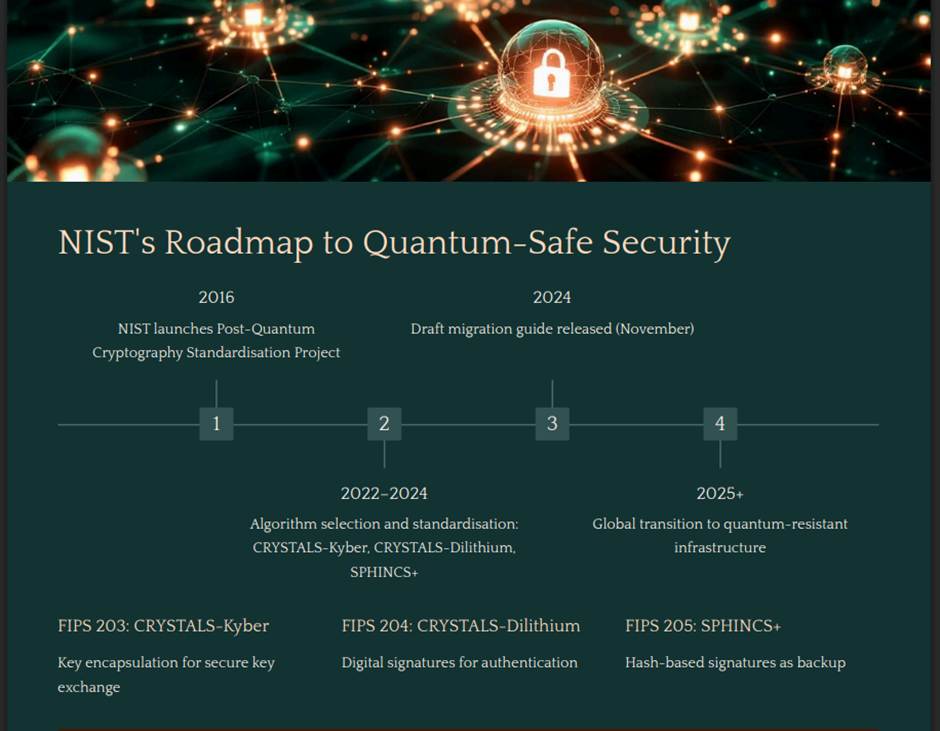 The U.S. National Institute of Standards and Technology (NIST) has finalised a new set of Post-Quantum Cryptography (PQC) algorithms designed to withstand quantum-level attacks. Among these are CRYSTALS-Kyber for encryption and CRYSTALS-Dilithium, Falcon, and SPHINCS+ for digital signatures.