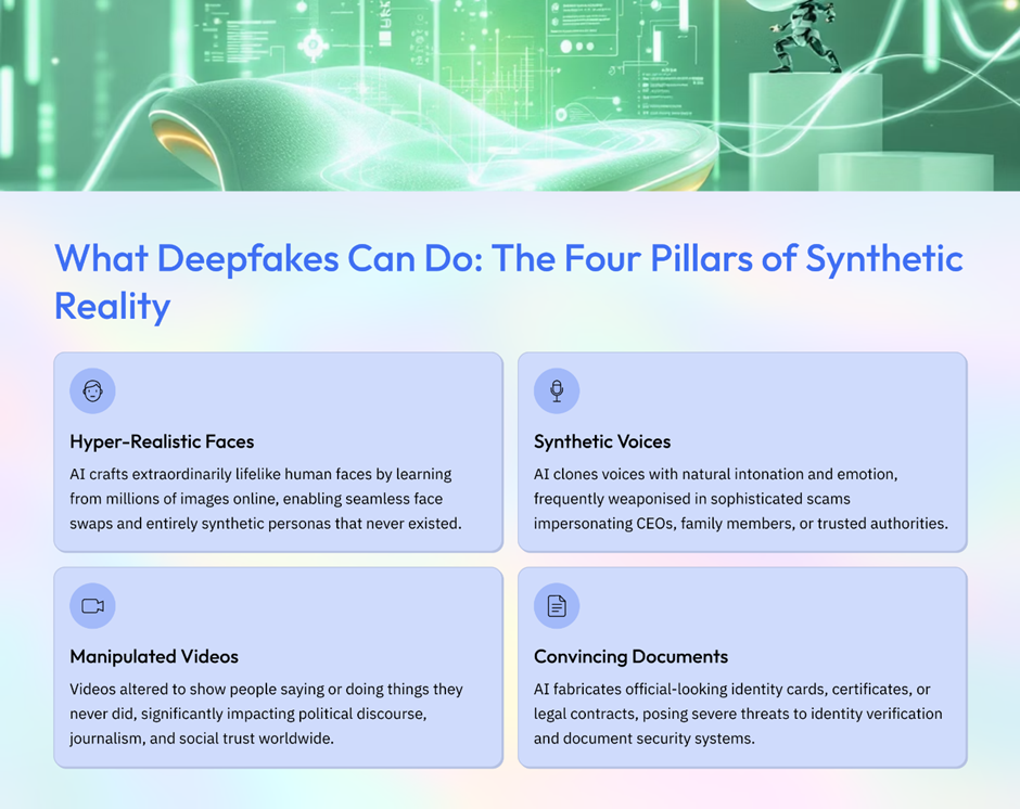 Deepfakes amplify this by enabling: