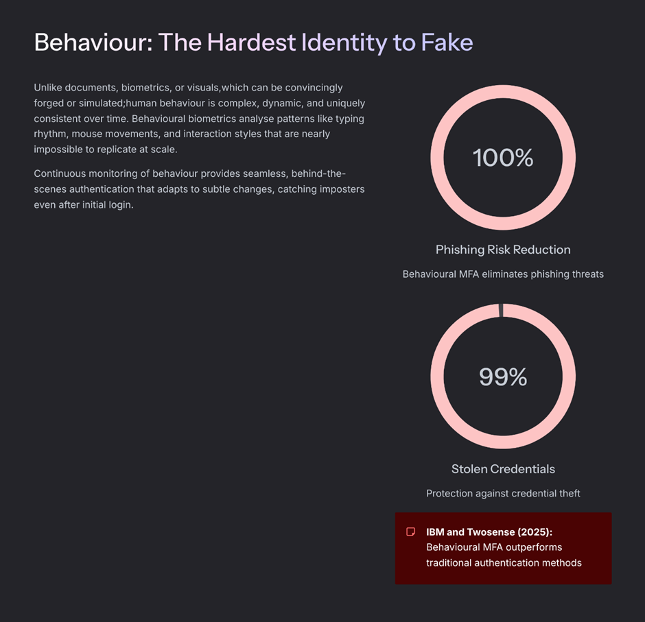 Behaviour is extremely difficult to fake consistently, and that is precisely why it has become such a powerful reinforcement for modern identity verification. While documents, biometrics, and visuals can now be convincingly simulated, sustained human behaviour remains far more resistant to manipulation at scale.